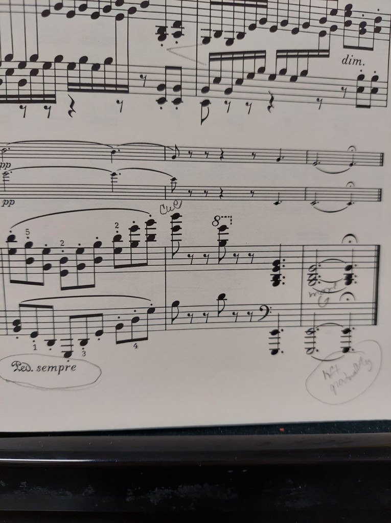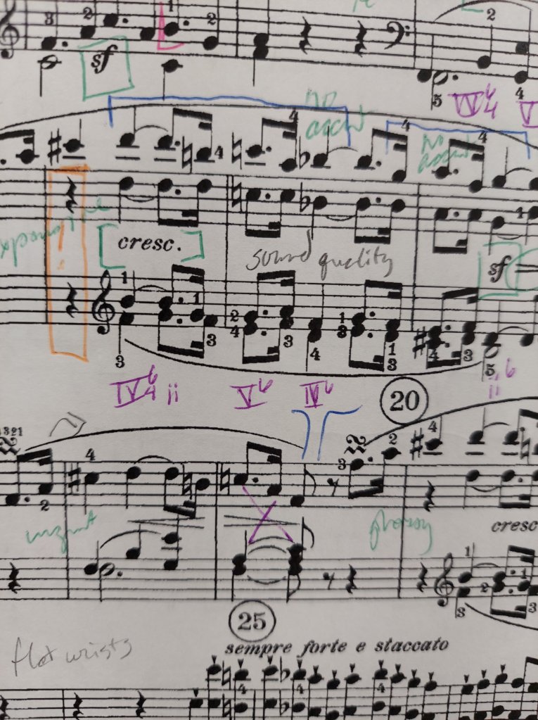 How a musician marks the score is deeply personal. I have seen preferences ranging from a completely pristine score, to every single fingering marked in, to so many layers of markings that the score is nearly illegible. For me, it depends on the scope of preparation. If I’m memorizing the music, I will work from a photocopy so that I can use colored pens to assist the memorization process. These scores are filled with information: analysis, fingerings, choreography, pedaling, interpretation, information from research, images, basically anything that might create a neural pathway and secure memorization.
